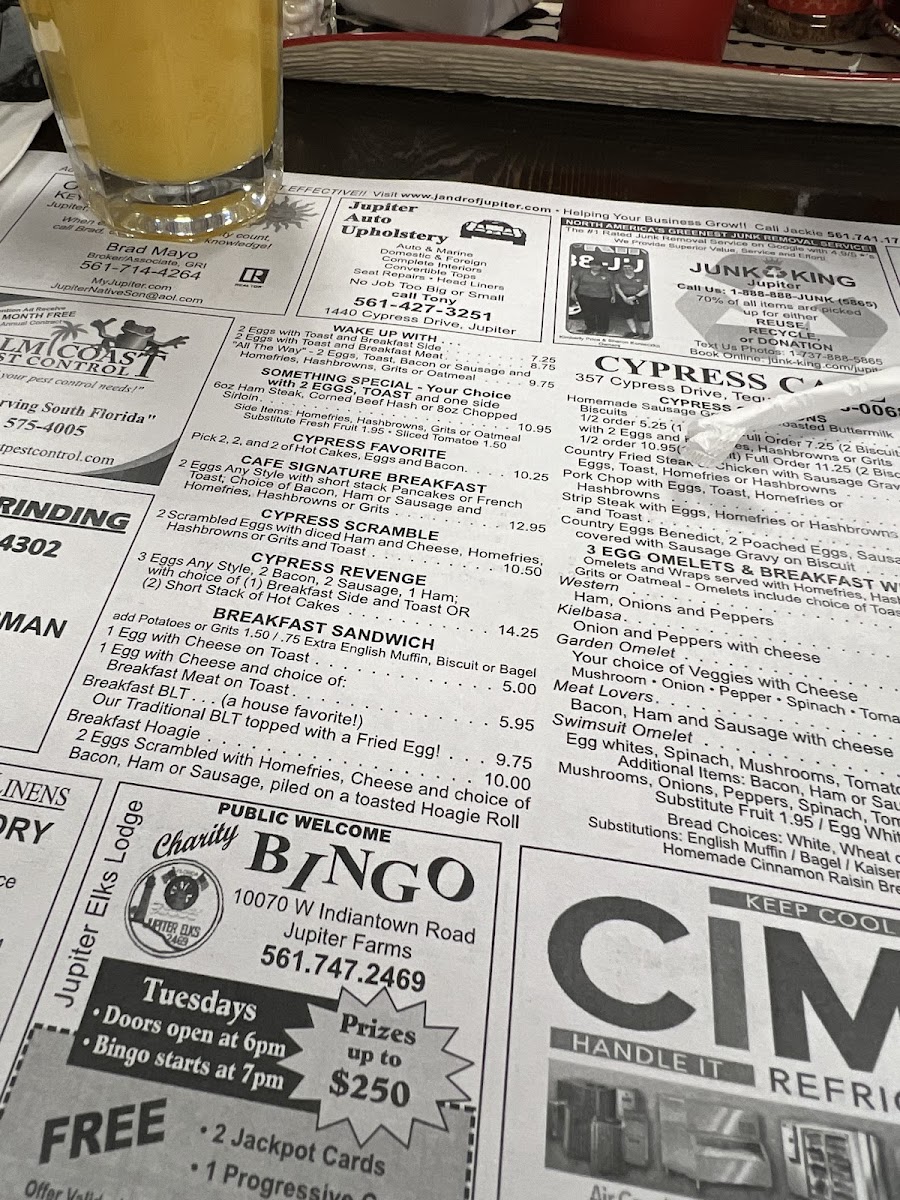 Welcome to Cypress Cafe, a charming local gem nestled in Jupiter, Florida. With its friendly atmosphere and a pledge to serve fresh, high-quality meals, it’s no wonder this cafe is beloved by residents. Their breakfast offerings are particularly noteworthy, featuring delightful choices like the All The Way 2 Eggs with crispy bacon and homefries for just $8.95, or their Cypress Favorite, which lets you mix and match hot cakes with eggs and bacon.